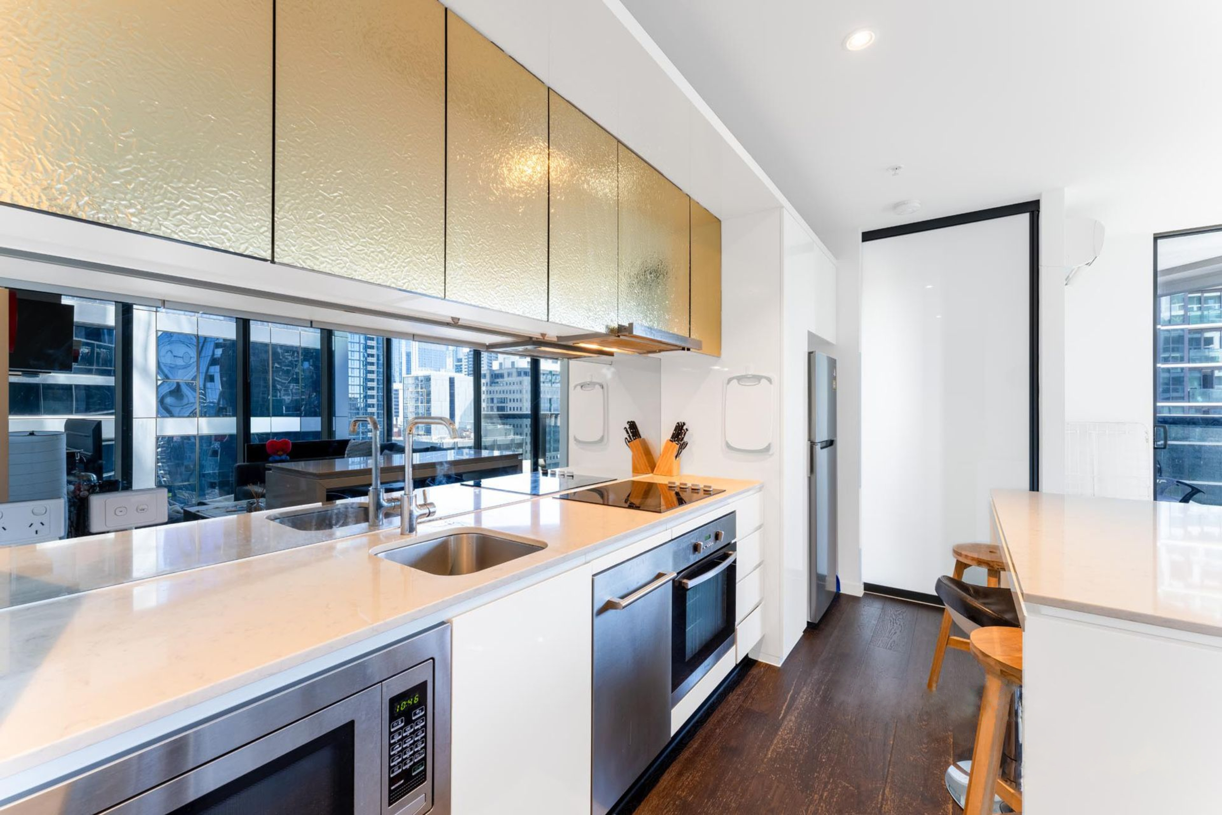 The modern kitchen is well-appointed with a stone island bench, mirrored splashback, and quality stainless-steel appliances — combining practicality with contemporary style.