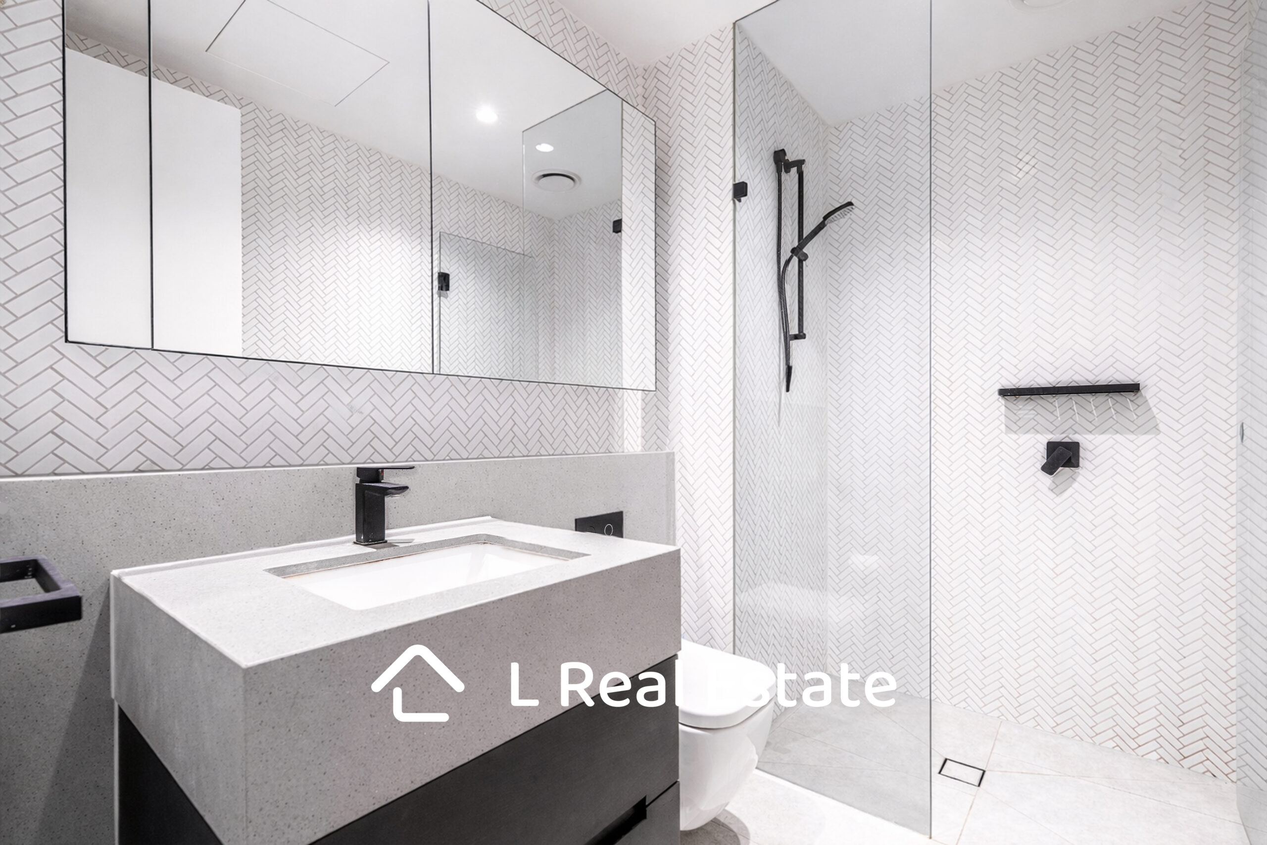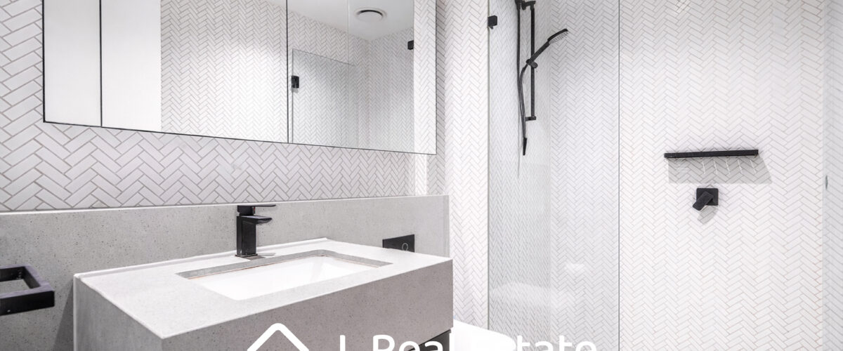 The spacious bedroom includes mirrored built-in robes, while the designer bathroom is finished with full-height tiling, stone surfaces, and high-end fittings, delivering a luxurious yet practical environment.