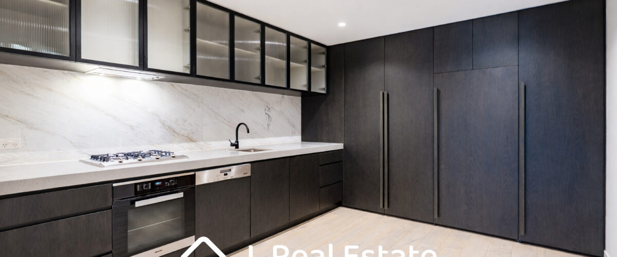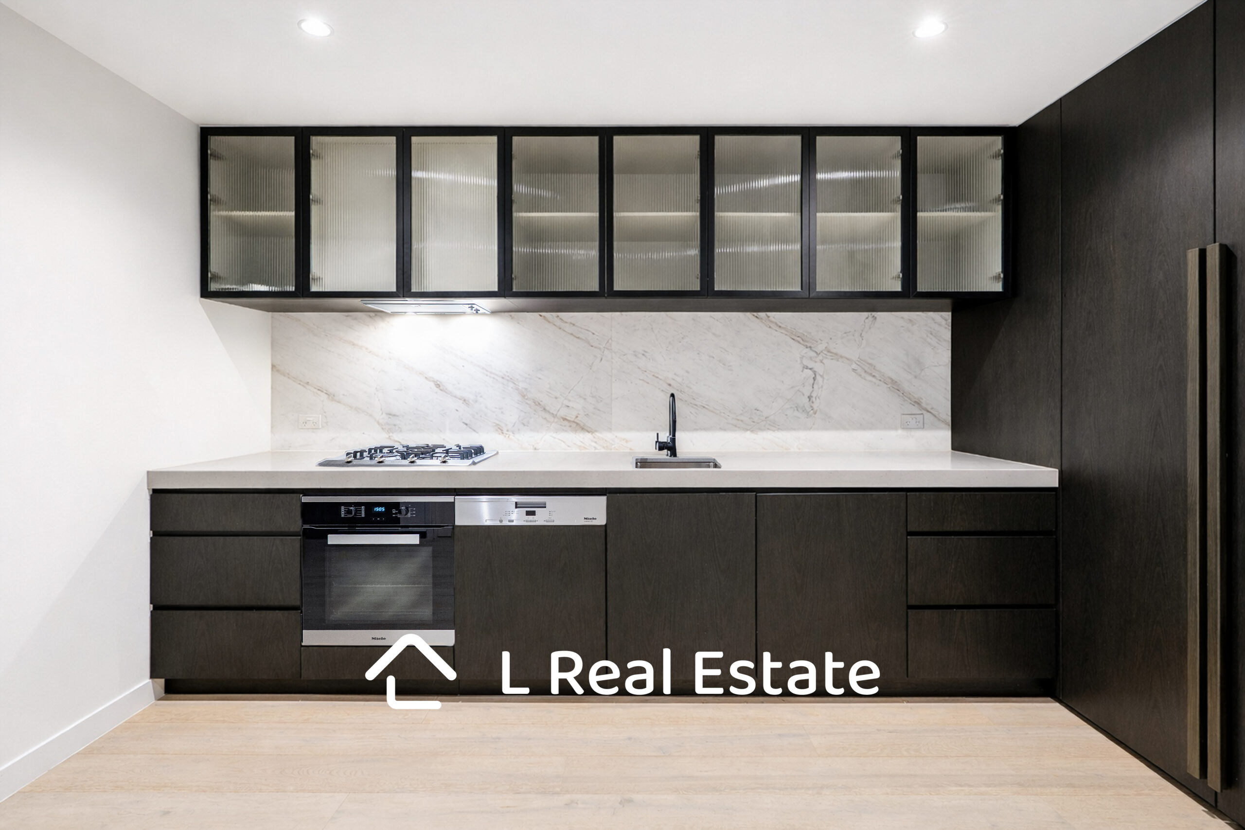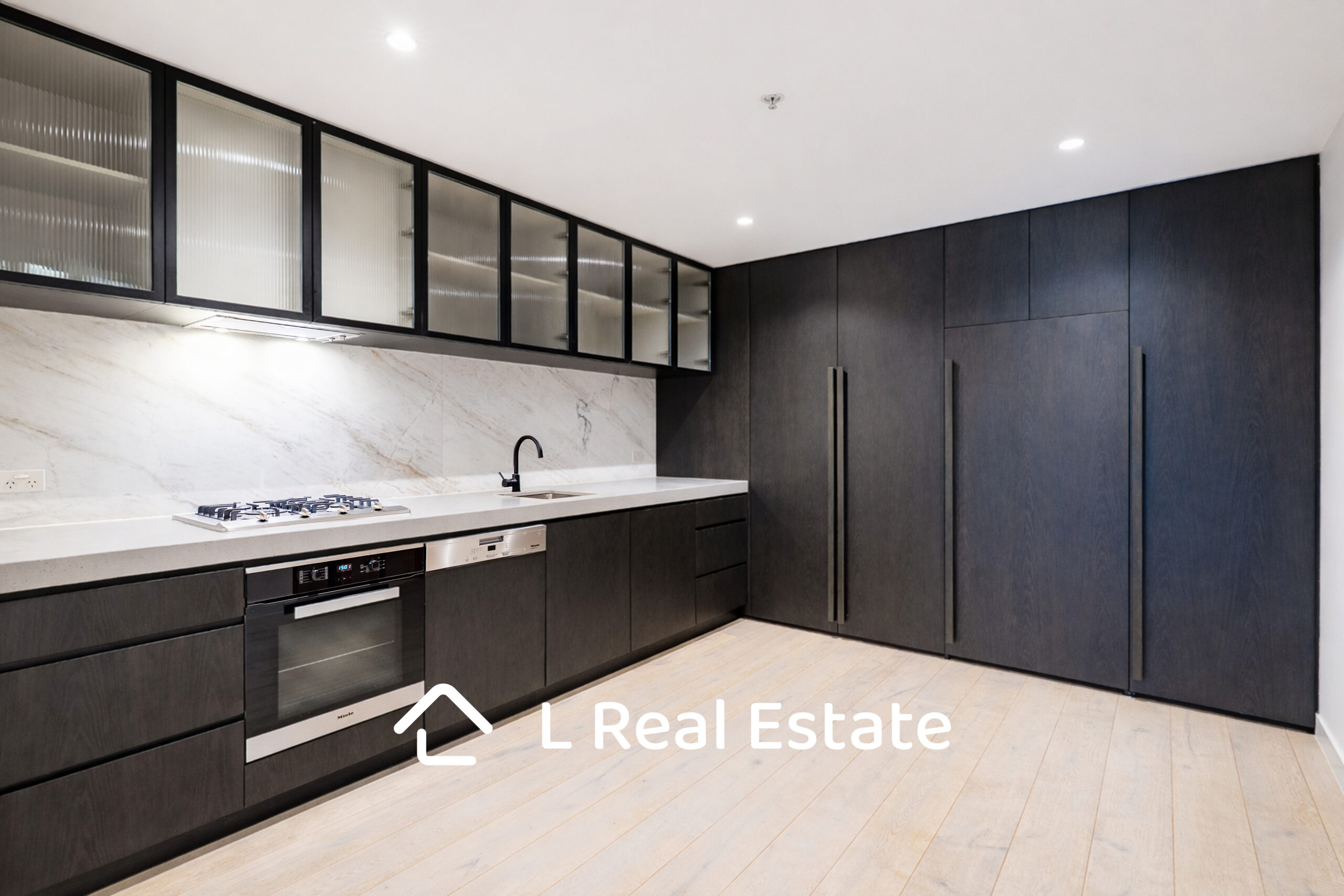 The sleek kitchen is designed for both style and functionality, featuring stone benchtops, premium Miele appliances, and integrated cabinetry for a clean, modern finish.